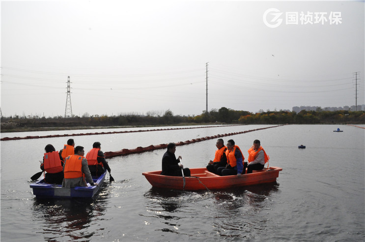領(lǐng)導(dǎo)們乘船在許小河生態(tài)塘內(nèi)查看水下森林及塘內(nèi)水質(zhì)