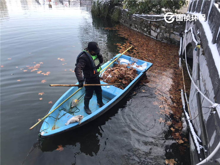合肥市逍遙津公園水環(huán)境治理項目運維人員雪后打撈落葉